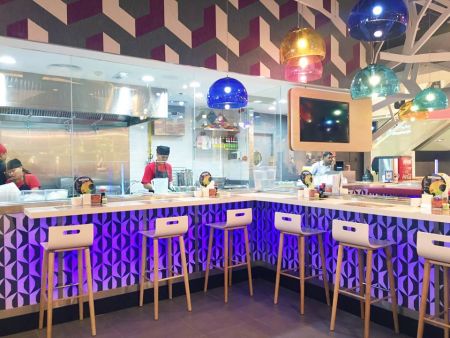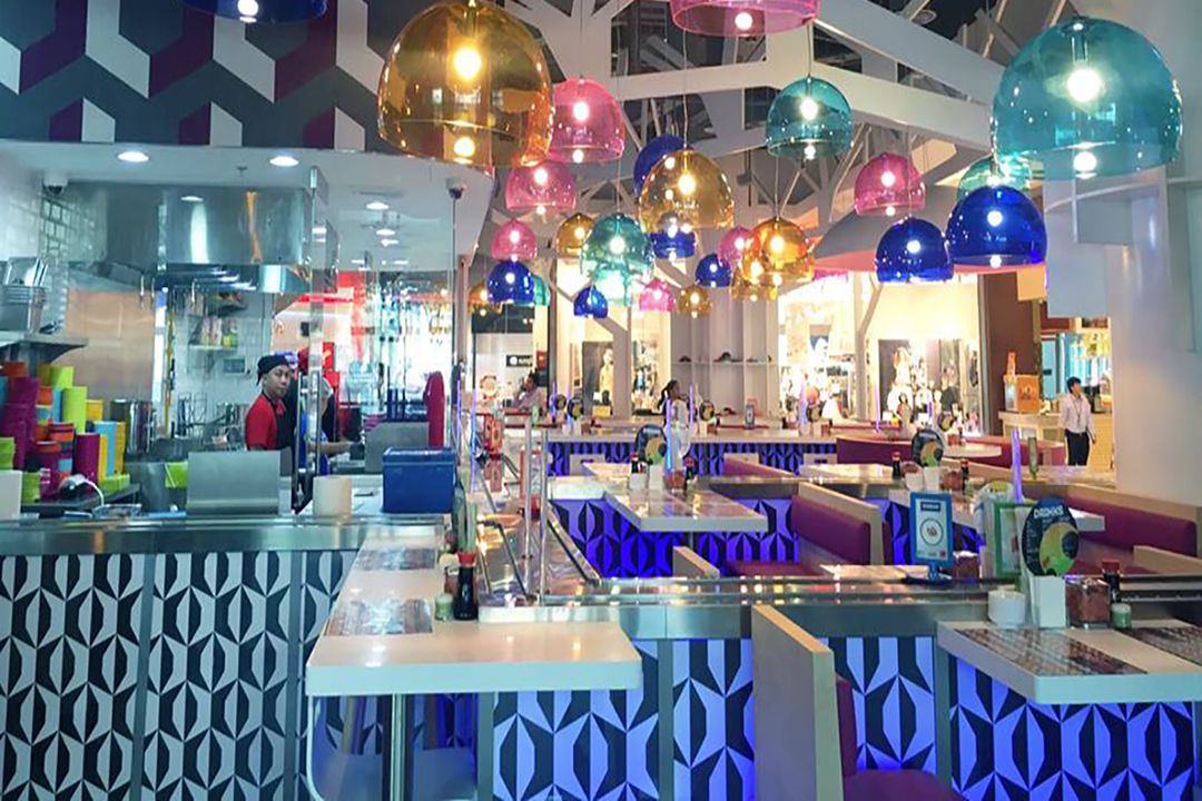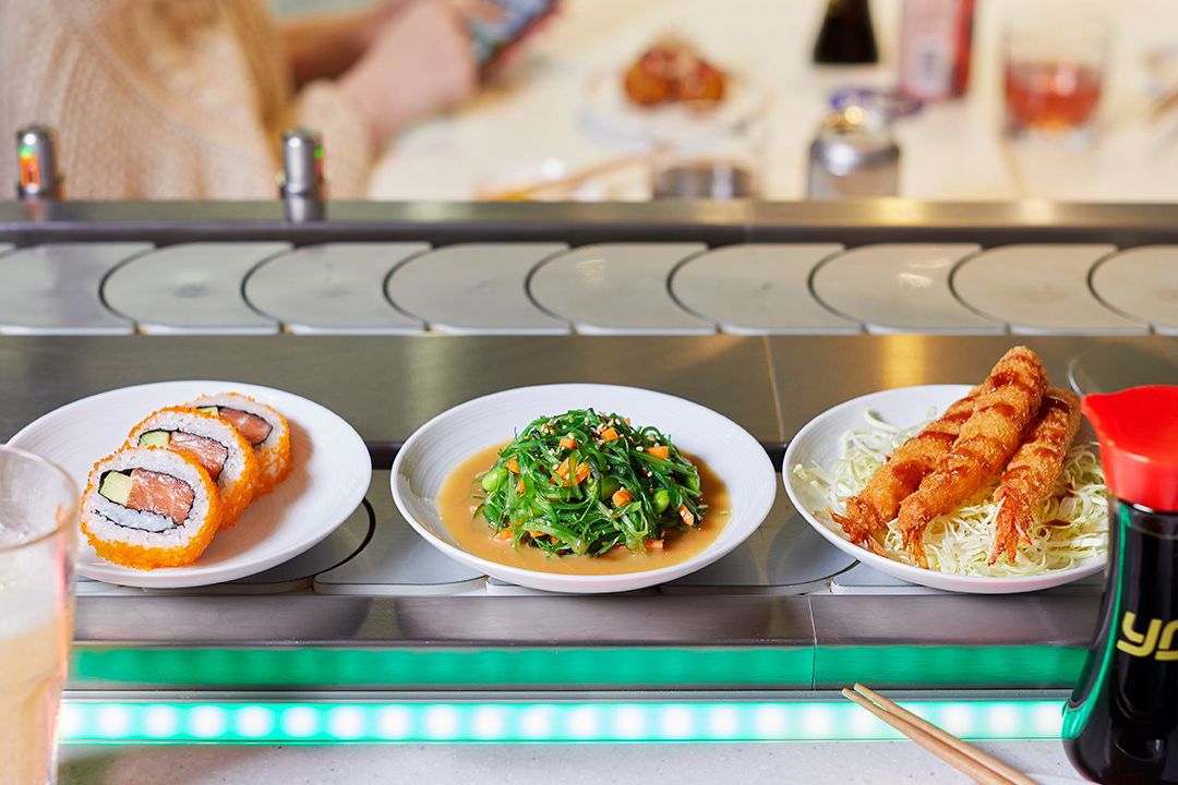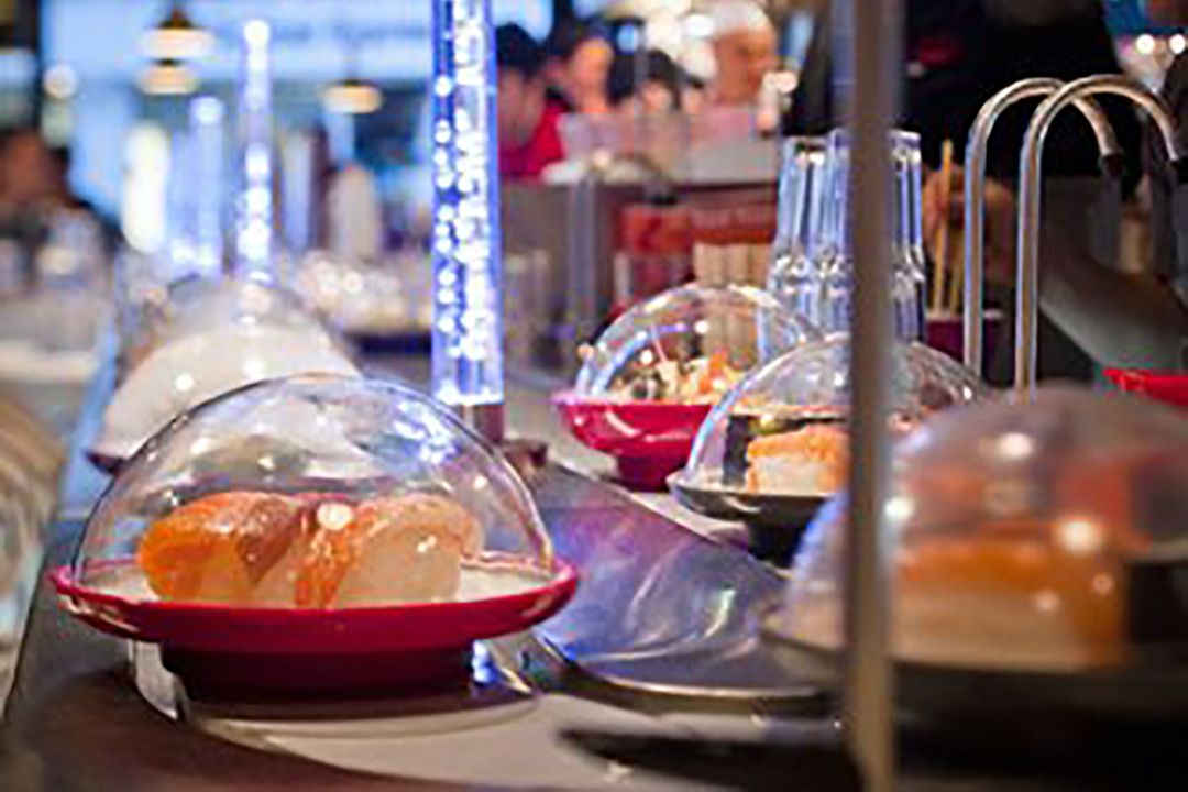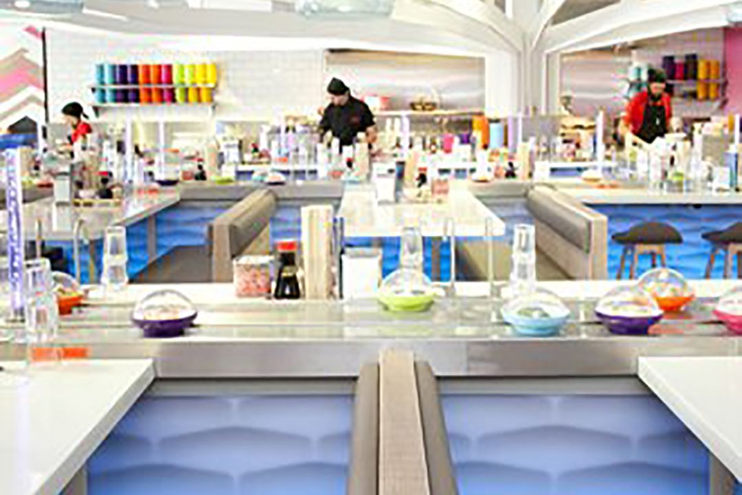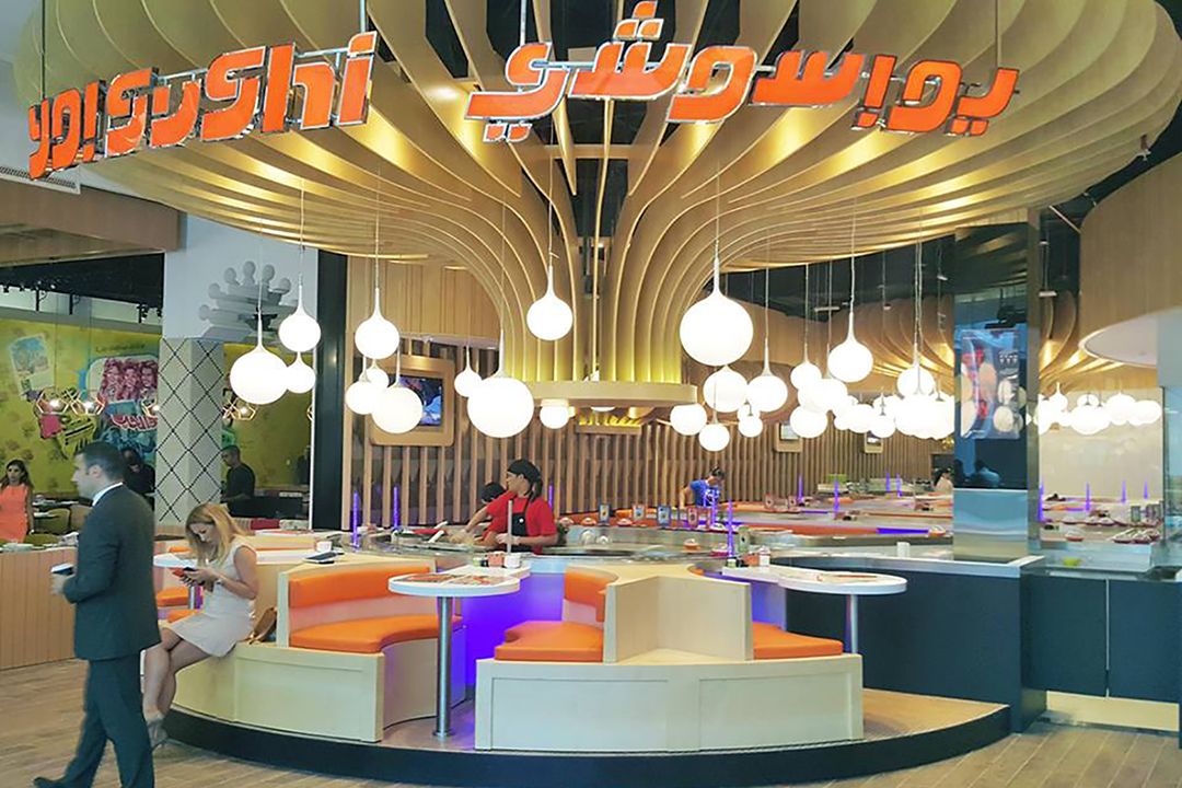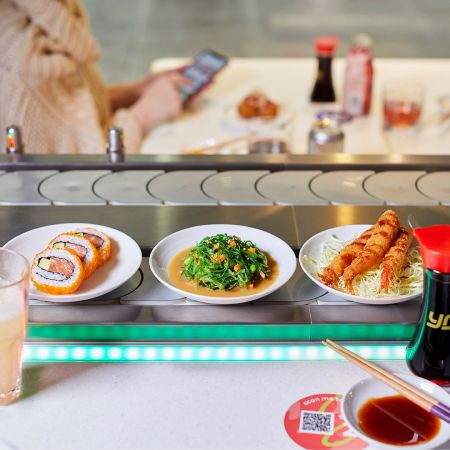 Zákazník "YO! SUSHI" na Středním východě v Dubaji vytvořil samoobslužnou sushi restauraci s pásovým servisem díky speciálnímu designu na sushi talíři, víku a bublinkových lustrů v obchodě!