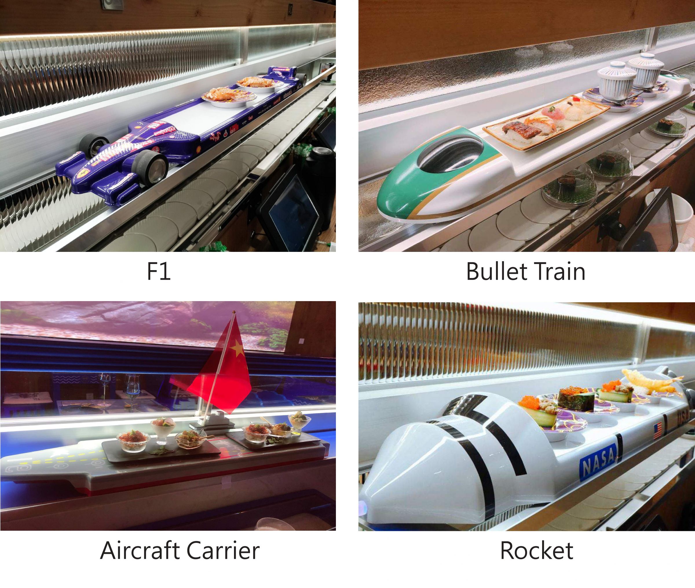 - ट्रिपल-लेयर – सुशी ट्रेन (फूड डिलीवरी सिस्टम शिनकानसेन) डिलीवरी सिस्टम