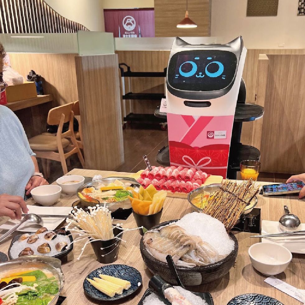 拥有百道烧肉料理、火锅、日式手卷、哈根达斯等吃到饱的野村烧肉,用超萌的熊熊造型火锅疗愈吸睛,再加上可爱的猫咪送餐机器人,享受双重的可爱! 智能配送更安心,最简单的送餐服务,就交给鸿匠送餐机器人-贝拉,让您的烧烤历程,增添更多风趣:您的餐点已抵达,祝您有个愉快的用餐体验!