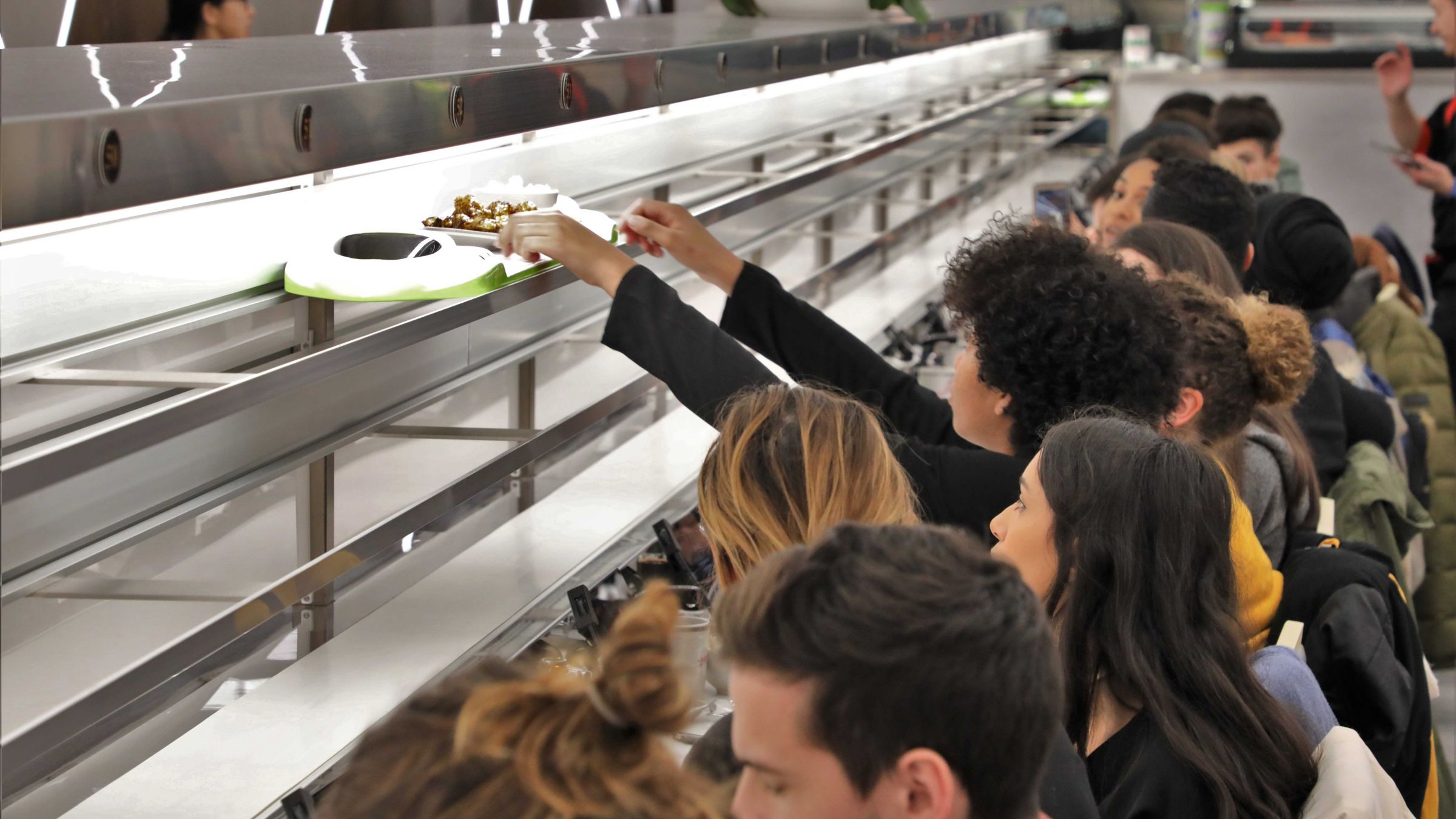 這種模式把原本繁瑣的外場服務變成「半自助化」,用輸送帶或送餐小火車直接把菜送到客人面前,省去了員工跑來跑去端菜的力氣;再加上桌邊就有自助給水和點餐系統,員工不用一直跑桌邊,一個人就能顧好幾桌。