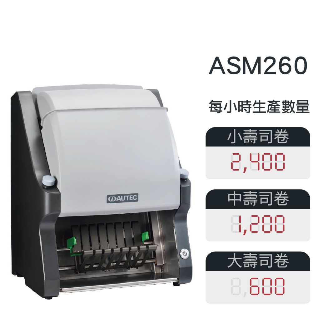 AUTEC ASM260 是一款專為商業設計的高效率自動切卷機。具備專利 SBS 誤安裝防止裝置與俐落的切割技術,支援細捲、中捲、太捲及加州捲切割,大幅縮短備餐時間。