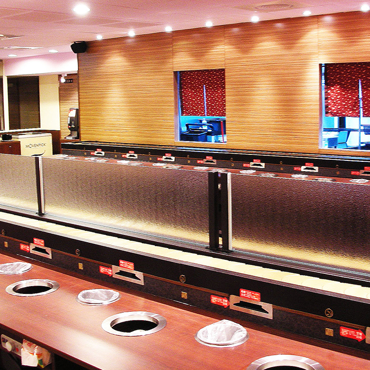 - 隱藏式收盤系統:設協助餐廳桌面整潔的「隱藏式收盤系統」讓您降低服務人員桌前服務,以降低人力成本的支出!「隱藏式收盤系統」設置於每個坐位前,讓客人用餐完畢後盤子可直接投入收盤系統,讓桌面整潔不髒亂!