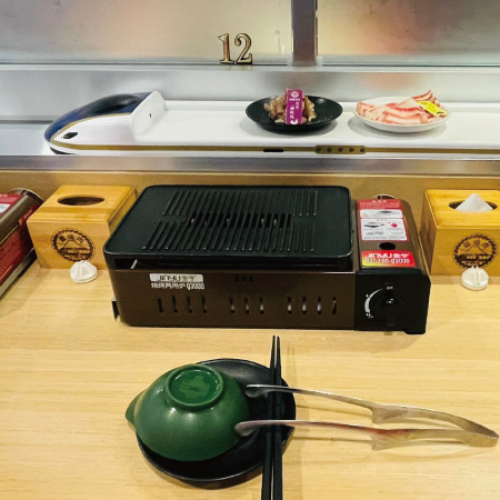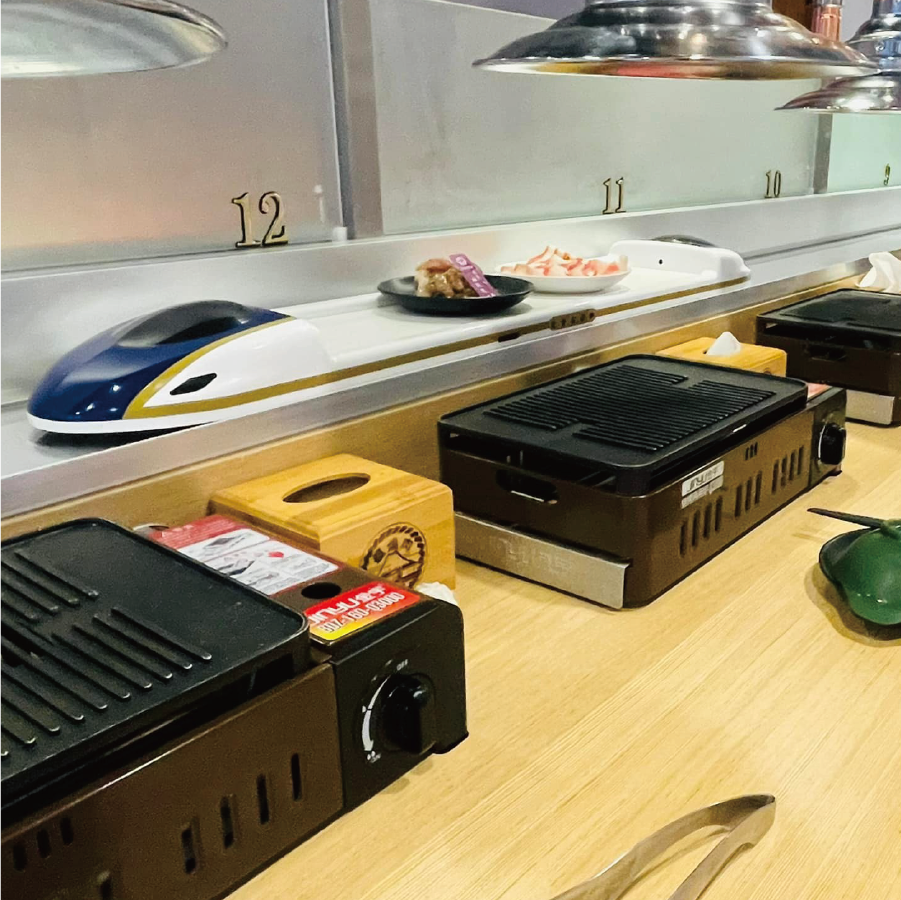 彰化鹿港的瘋燒肉擺脫傳統燒肉店,採用新幹線自動送餐系統搭載QR-CORD掃描點餐,由線上訂餐將訂單送到廚房,跳脫傳統的菜單點餐模式,並直接從廚房透過新幹線列車,不經他手地將生鮮餐點送到客人餐桌面前,讓客人在最快的時間點收到菜品,進行燒烤饗宴。