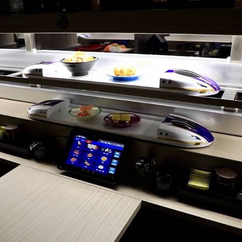 什麼,到夏威夷也能享受日式料理? 沒錯,夏威夷元氣壽司選用鴻匠「智能自動送餐系統」搭配平板點餐系統,讓饕客只要食指一點,美食即乘著子彈列車送到桌邊。「智能自動送餐系統」搭配無時差的點餐系統,讓客人入座後即可直接點餐、連結訂單到廚房內場,省下呼叫服務生到桌邊等候時間,亦可避免外場送訂單到內場的虛耗時間,大幅減少無謂的人員耗用及時間浪費。 新幹線送餐車可依照店面顏色主題客製化設置,讓各個餐廳都能凸顯自我特色,同時省時、省力、低成本!為業者提高翻桌率,更讓外場服務生不需要浪費心力在送餐上,提供更即時的服務,比傳統餐廳大幅提升了作業效率 !