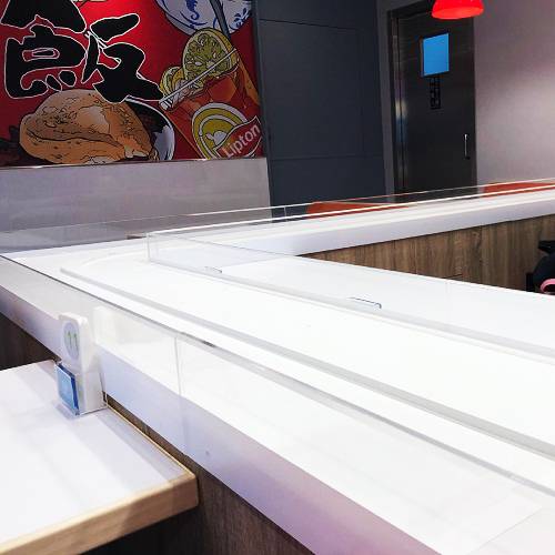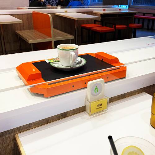 為了加強客戶體驗提昇,軌道送餐車也加設了「聲音到站提醒功能」,當餐點送達時,客人在座位上可以自行取餐的同時,將會聽到送餐車內建的提醒音效以及燈光閃爍的提醒模式,客人在用餐過程中也更加流暢,不僅減少服務人員來回穿梭送餐的服務成本,節省了送餐的時間,服務人員可以將心力投入在對於客人的客服升級。